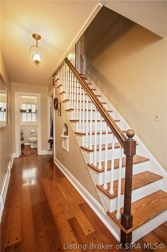 A staircase with delicate, tapered balusters and newel posts rises from the center hall to the upper level. Four bedrooms are found upstairs, each with wood flooring and a closet.